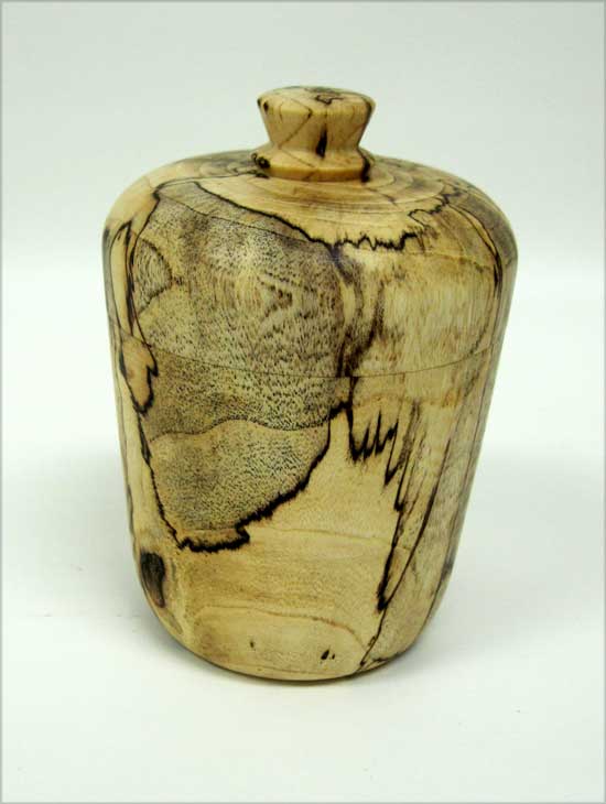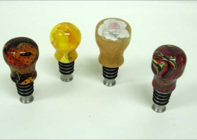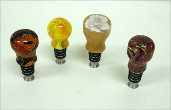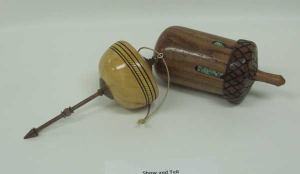 Tom Canfield brought two nice lidded boxes, a larger one of spalted Texas olive wood (Danish oil) and a smaller one of mesquite (wax only). George Taylor showed a delightfully off-centered natural edged bowl of pear and a whole colorful flowery bunch of turned plastic wine bottle stoppers.