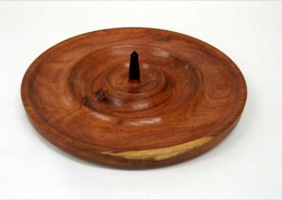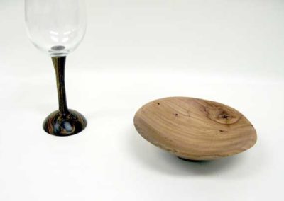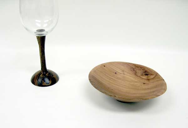 John Stegall showed a jewelry/ring holder that he promoted as a lesson in what not to do. He just decided to work on the middle ring first, turned it too thin and then had to fight the unsupported outside as he shaped it. He finally got it as far as it could, but still left it quite hefty because he couldn’t remove enough of the outside without chatter damage. Rick Webster had a couple of bowls to show of pecan and also brought, for advice, a wine glass stem. He got lots of advice including what glue to use (epoxy) for his cocobolo stem.