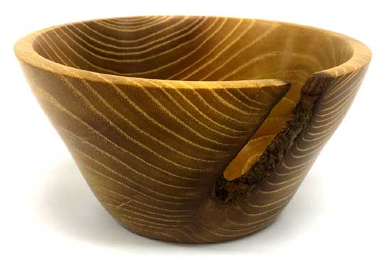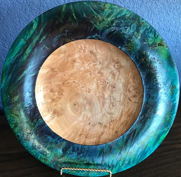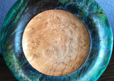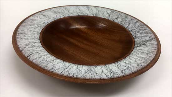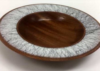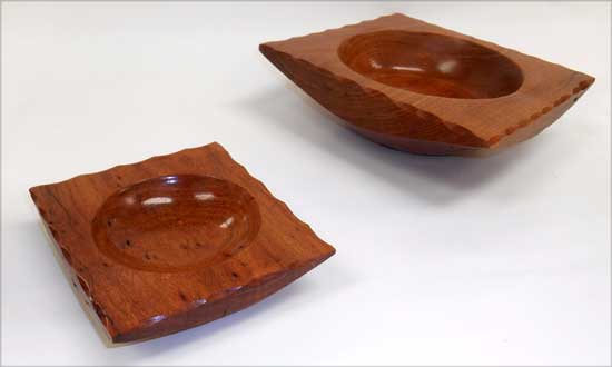 Rick Webster showed an Osage orange bowl with a giant gap in the side. It looked like a natural yarn bowl. Tom Whiting brought a crotch hollow form of mesquite and turquoise. George Taylor Showed a great sapele bowl with a faux marble painted rim. The “Ordinary” show-and-tell stuff included Ken Morton’s orange agate box with nicely chased threads. Ken also got a second billing for his finishing (finally) his wife’s four Box Elder bowls that James Johnson cored and turned from a single smashing block. James Johnson brought a great lacquered and dyed ash bowl.Rick Webster showed an Osage orange bowl with a giant gap in the side. It looked like a natural yarn bowl. Tom Whiting brought a crotch hollow form of mesquite and turquoise. George Taylor Showed a great sapele bowl with a faux marble painted rim.