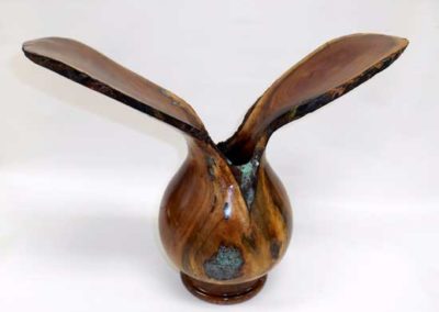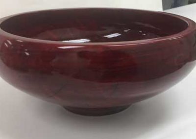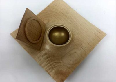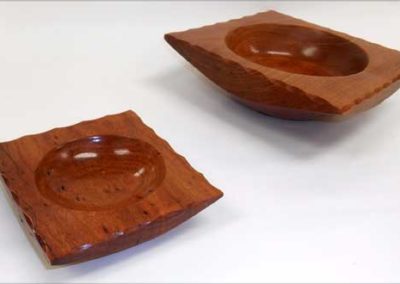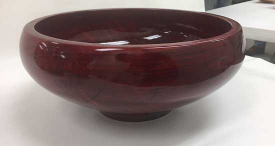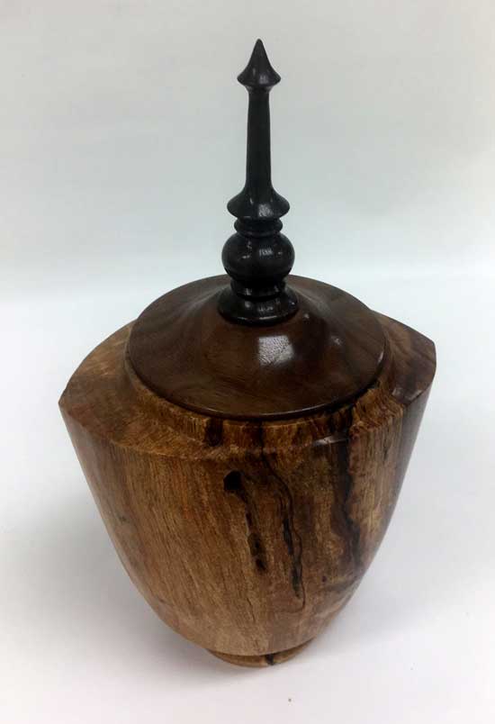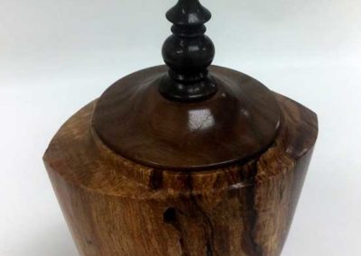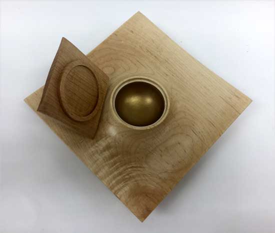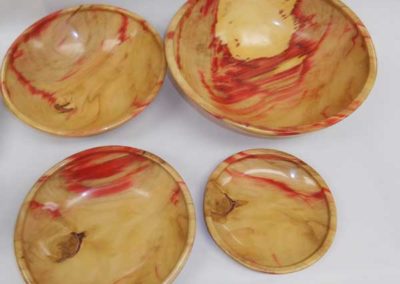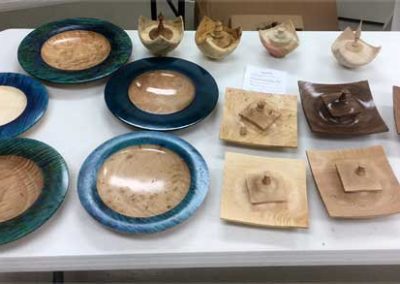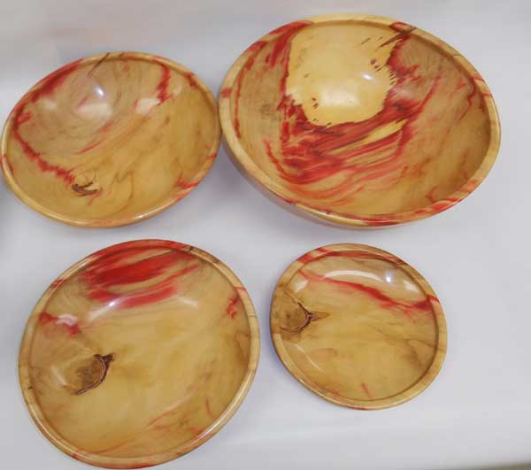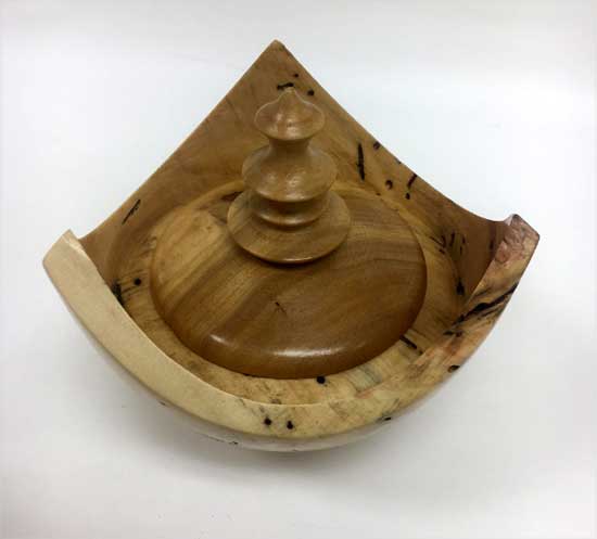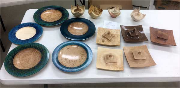 The “Ordinary” show-and-tell stuff included Ken Morton’s orange agate box with nicely chased threads. Ken also got a second billing for his finishing (finally) his wife’s four Box Elder bowls that James Johnson cored and turned from a single smashing block. James Johnson brought a great lacquered and dyed ash bowl.