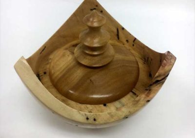 Show and Tell: There was a display of the products of the recent Jimmy Clewes workshops on hand by our members. It turned out to be a great show and tell evening. I have selected a couple of pieces, not necessarily the best, but it was a hectic evening with so much work shown it got to be hard to see who did the work. First, the Jimmy Clewes products. A few from this bunch: Wendell White showed that he isn’t just a pretty face of Corian, but a skilled selector and hewer of wood with his demo bowl that Jimmy C. called “Google Earth” for the rim effect. Tom Canfield showed us a nice turn of the block with his box elder three cornered box. Unnamed did a great square-square bowl with nicely dressed top and well done “gilding” of the center.