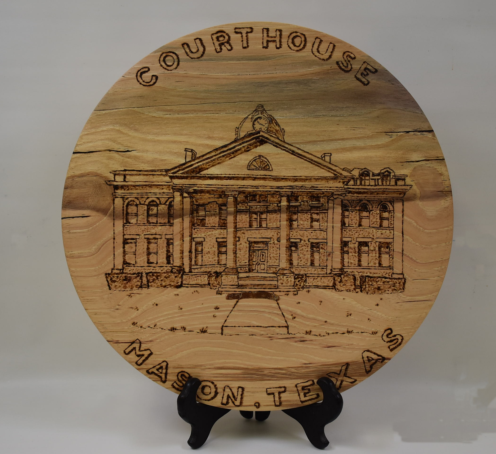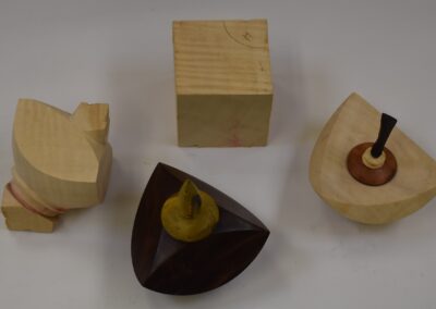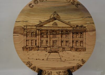 Tom Canfields piece is Carmelized Figured Birch; Anna Rachinskys works are made from Walnut and Agarita and Boxelder and Cherry; Roger Arnolds piece is Pecan and was done for the Mason County Courthouse fundraiser.